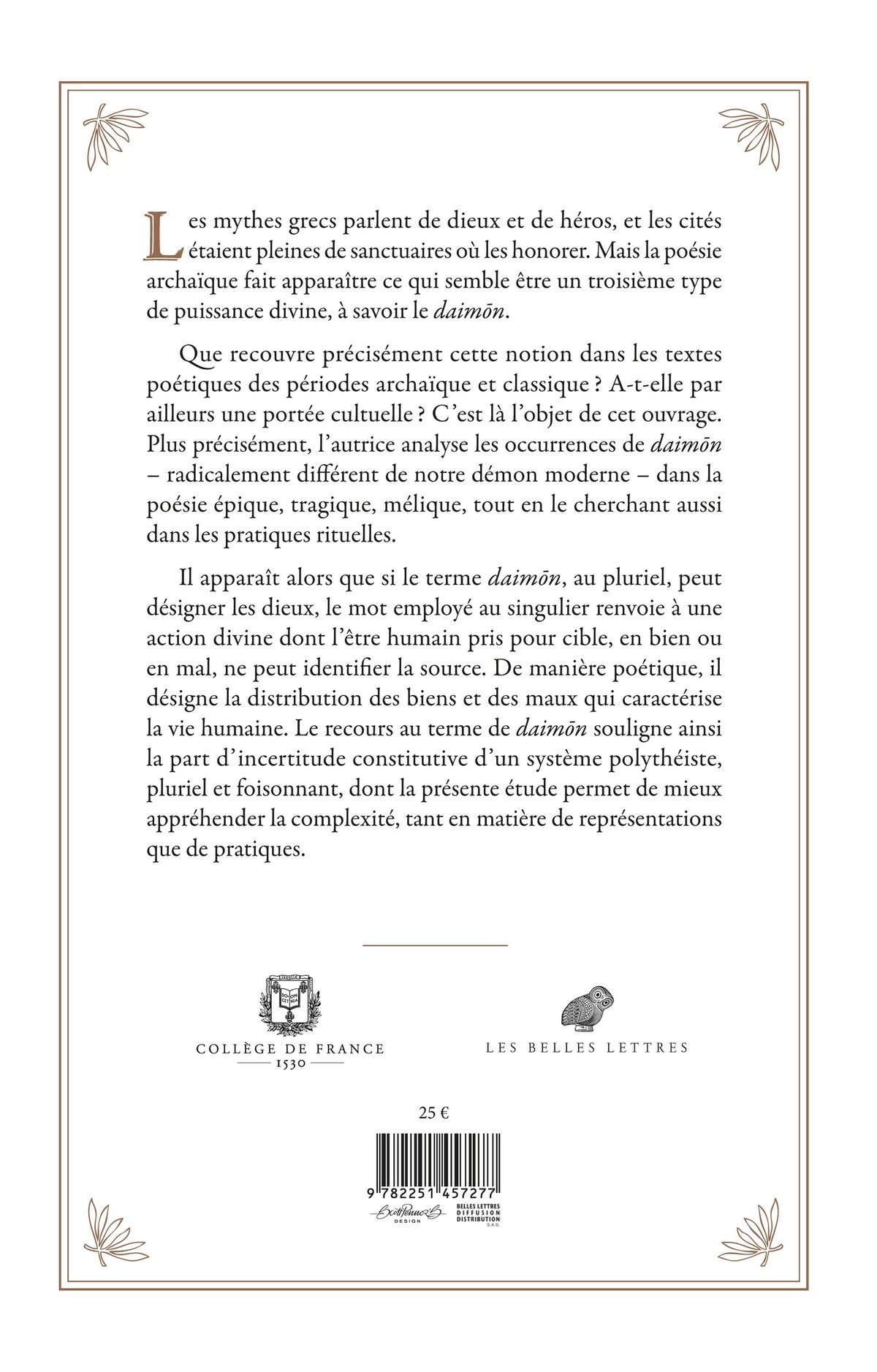 Il apparaît alors que si le terme daimōn, au pluriel, peut désigner les dieux, le mot employé au singulier renvoie à une action divine dont l’être humain pris pour cible, en bien ou en mal, ne peut identifier la source. De manière poétique, il désigne la distribution des biens et des maux qui caractérise la vie humaine. Le recours au terme de daimōn souligne ainsi la part d’incertitude constitutive d’un système polythéiste, pluriel et foisonnant, dont la présente étude permet de mieux appréhender la complexité, tant en matière de représentations que de pratiques.